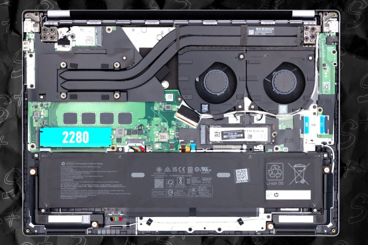 至于说札记本的里面,就没什么颠倒值得说的了,和前代比拟有所迁徙,最清亮的变化即是撑执双M.2 2280了,前代是单SSD。札记本接管双电扇双热管决策,不外两个电扇放在了同侧。