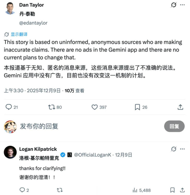 但很快,Google 人人告白部负责东谈主 Dan Taylor 在外交媒体上径直否定了这一说法,称「Gemini App 目前莫得告白,也莫得现时商量编削这少许」。这说明,Google 至少在公开语境里是保抓严慎的。